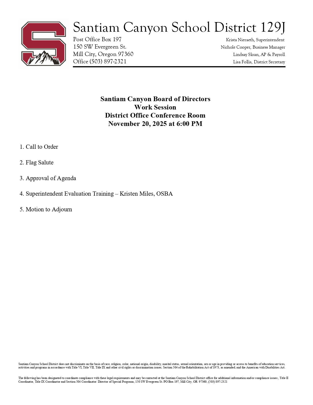 The Santiam Canyon Board of Directors will be holding a Work Session on Thursday, November 20th, 2025, at 6pm at the District Office Conference Room. For more information, please visit SCSD's Board B. . .