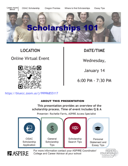 ASPIRE Scholarships 101 (Open to all, but geared toward 11/12 grades) This presentation provides an overview of the scholarship process. Time of event includes Q & A Wednesday, January 14, 6:00...